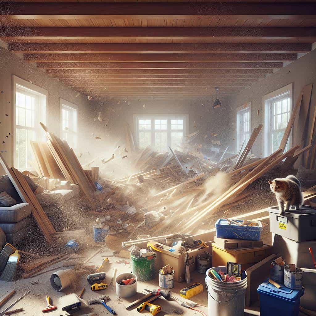 I once found myself knee-deep in what I can only describe as a domestic apocalypse. Picture this: walls stripped bare like a turkey carcass after Thanksgiving, tools scattered about like a toddler’s toy box, and my living room, now a makeshift construction zone with dust dancing through the air like it was auditioning for some avant-garde performance. To top it off, I’m pretty sure I lost my cat somewhere between the mountains of drywall and the forest of paint cans. It’s the kind of chaos that makes you question all your life choices, including that last trip to the hardware store where you bought a sledgehammer on a whim. But hey, nothing says “home sweet home” quite like the thrill of potentially stepping on a rogue nail.